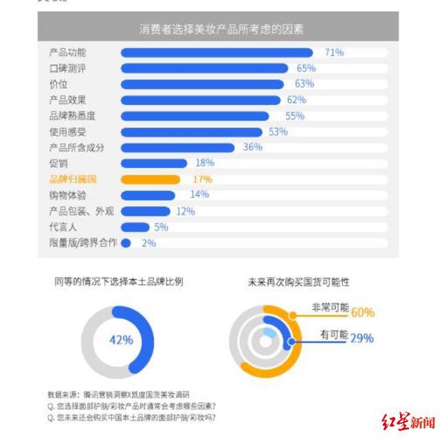 根據騰訊5月發布的2019年《國貨美妝洞察報告》顯示,中國美妝品牌占據市場份額的56%,同時有42%的消費者更愿意選擇國貨美妝品牌,其中接近九成消費者表示未來會回購。