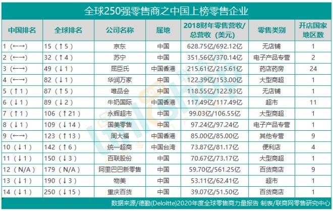 值得一提的是,在全球前100強零售商中,中國內地有京東、蘇寧、華潤萬家、唯品會4家,中國香港有屈臣氏、牛奶國際2家。