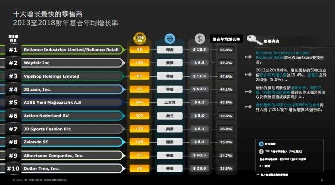 從2013至2018財年復合年均增長率來看,唯品會以47.8%的復合年均增長率,京東以44.1%的復合年均增長率躋身全球十大增長最快的零售商,其余上榜企業均為美國、德國、荷蘭、土耳其、印度等國企業。