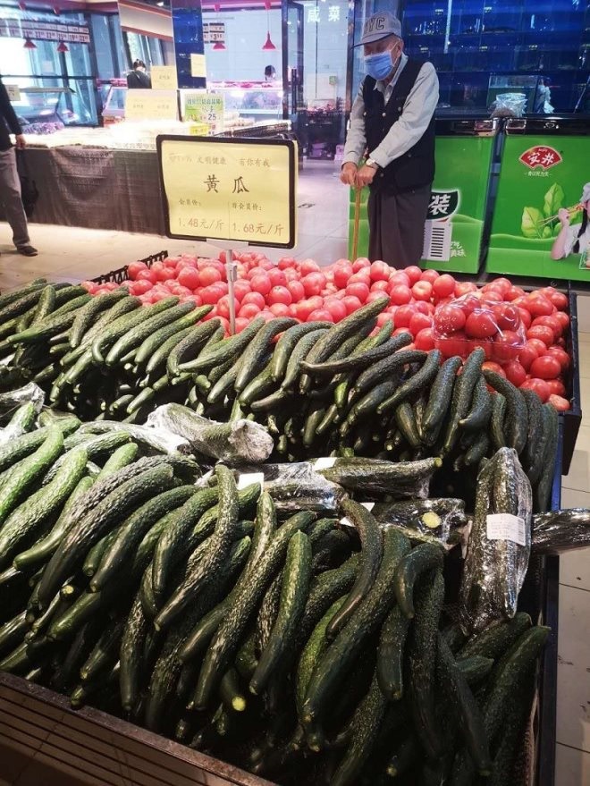 壹公里店鋪內(nèi)的黃瓜、西紅柿攤位