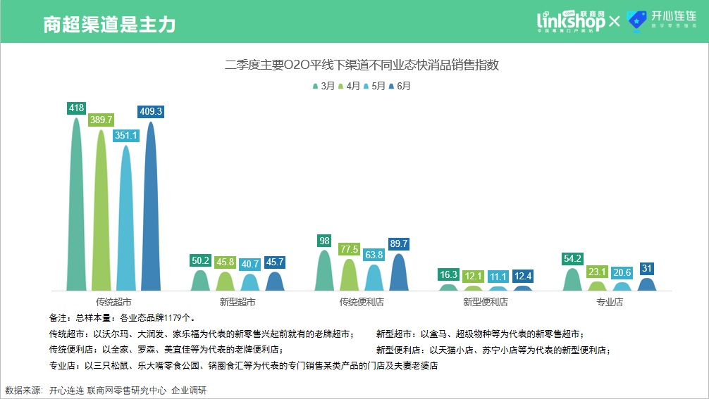 從數(shù)據(jù)上看,二季度主要O2O平臺(tái)快消品銷售渠道中,傳統(tǒng)渠道依舊是主力,其中傳統(tǒng)商超便利店占比超過80%。