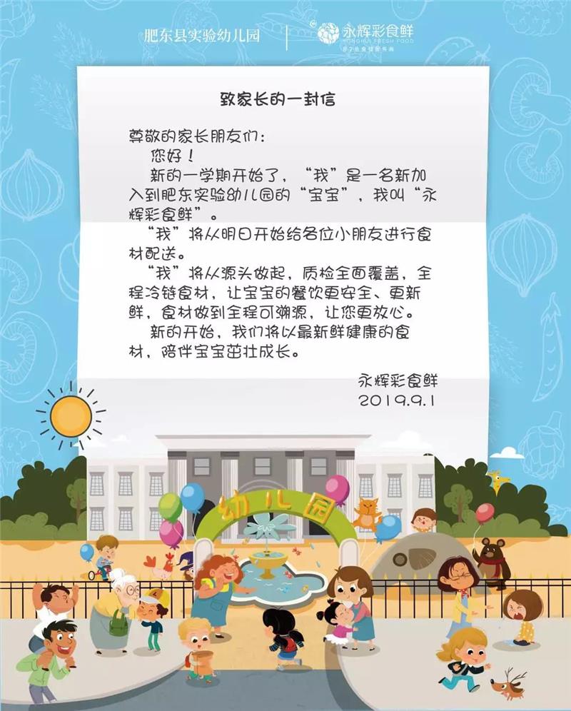 9月2日起,彩食鮮將作為肥東實驗幼兒園的食材供應商,配送食堂每日所需的新鮮食材。以此為契機,彩食鮮公開了“致家長的一封信”,表達了彩食鮮嚴守食品安全的決心與信心。