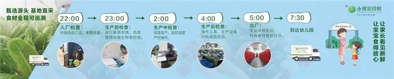 在活動現場,彩食鮮借助展板,向家?生動地呈現了這一概念:以時間為軸線,列舉了從食材入廠到配送至幼兒園的每一步,具體展示了彩食鮮的檢驗流程。