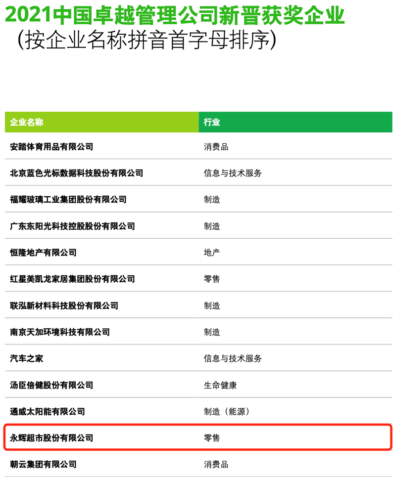 永輝超市榮獲“2021中國卓越管理公司”稱號
