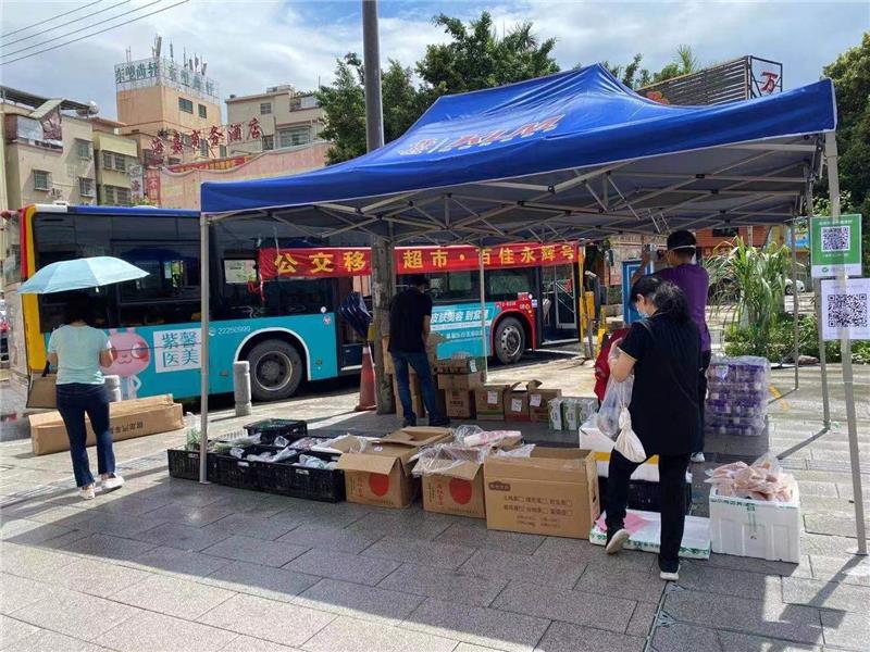 6月初,廣州市新型冠狀病毒肺炎疫情防控指揮部將荔灣區“南片”芳村片區調整為封控管理區域。為應對封控管理區域農貿市場關停的影響,保障居民基本生活物資需求,市、區商務部門迅速反應,開展 “公交移動超市”行動,安排多輛公交車每天分別進駐各重點街區為當地居民提供買菜服務。超市每天的營業時間不低于6小時,盡可能為居民的購物提供便利。