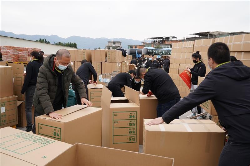 為保證支援物資盡快到位,永輝各方聯動,十余小時完成90萬件物資的調配并運抵永輝物流南嶼基地。90萬件物資,9000平方米空地,數十條生產線,近千名永輝人,爭分奪秒、連續奮戰27小時,終于完成了10萬份商品的拆包、分裝、打包工作。