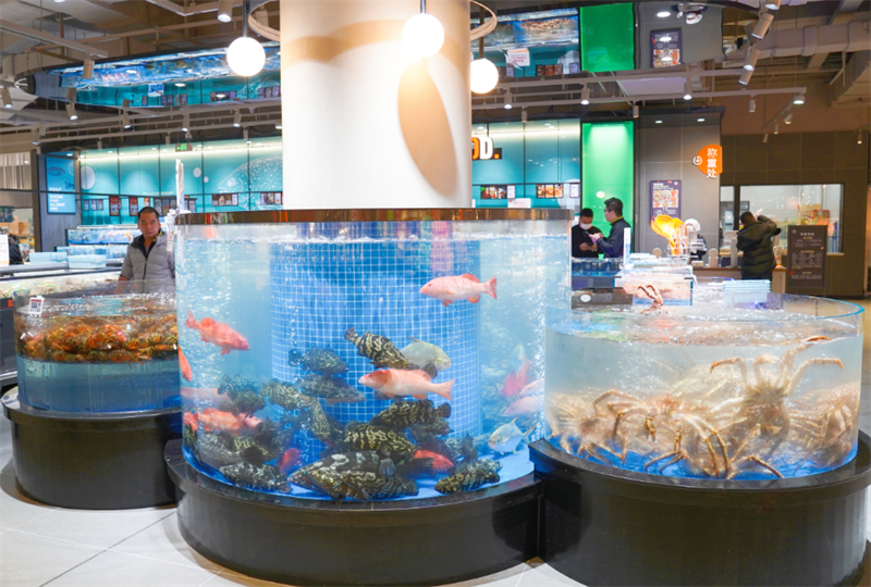 為匹配消費者的個性化需求,奧體店精心打造了整體場景,由胖東來天使城工程團(tuán)隊全程參與,發(fā)揮了極大的想象力,設(shè)計以淺灰色為主色調(diào),搭配橙色標(biāo)識裝飾增添活力,動線通道自由、寬敞,點綴幽藍(lán)色的觀賞海鮮魚缸,更添氛圍感。